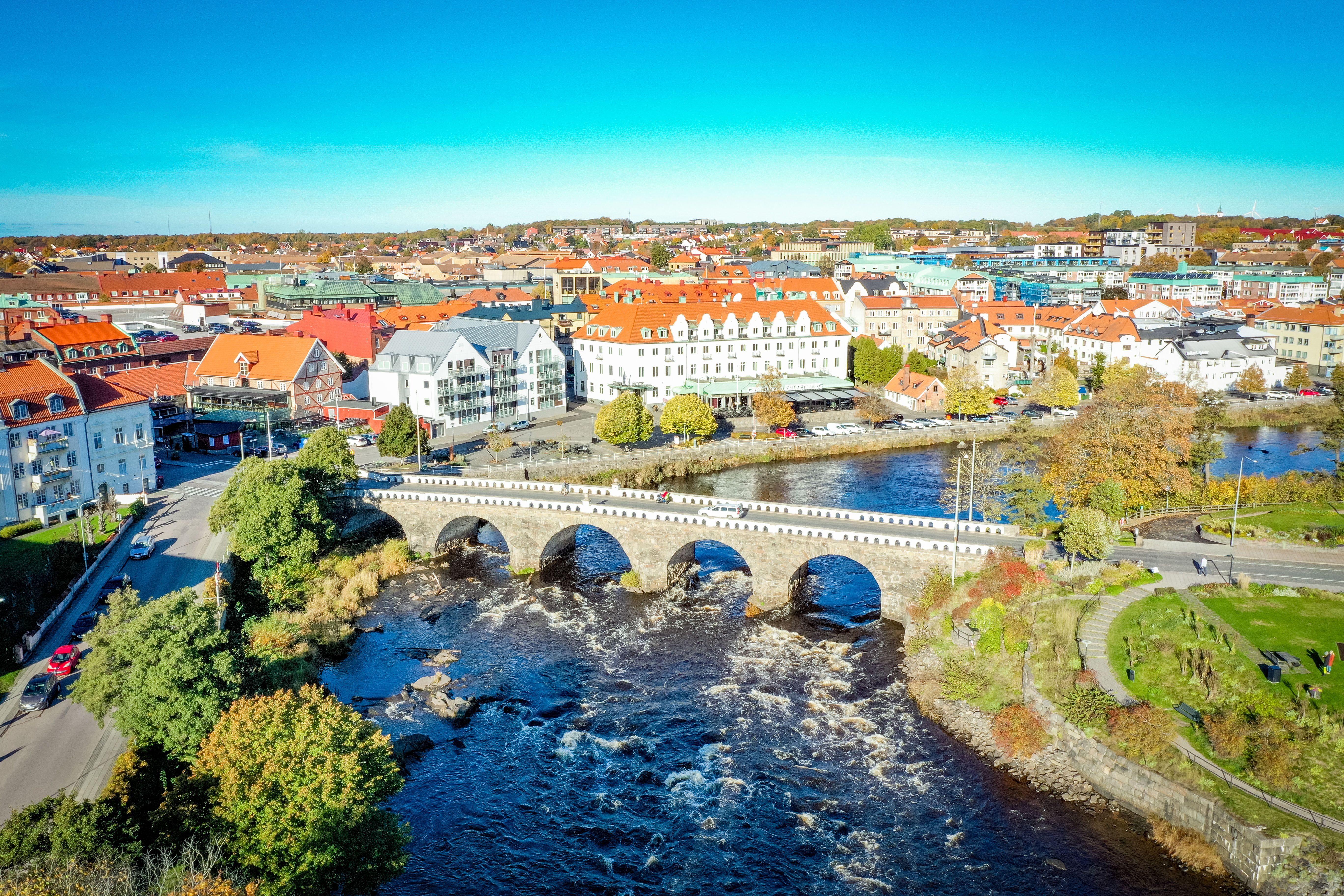 Flygfoto Falkenbergs centrum, Tullbron och Ätran.