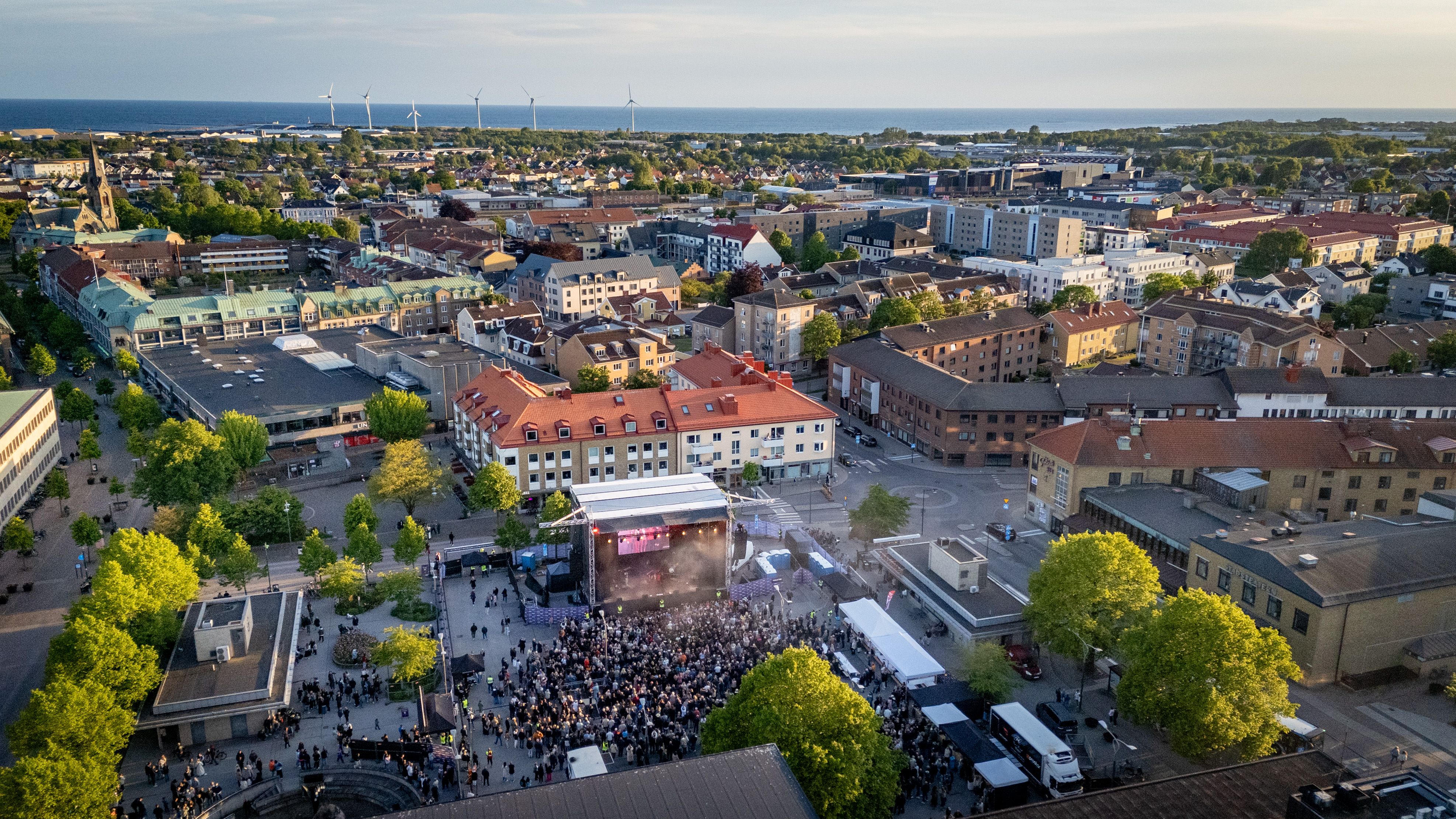 Flygfoto över Falkenberg centrum och Stortorget på sommaren. Konsert på Stortorget under Stortorgsfesten.