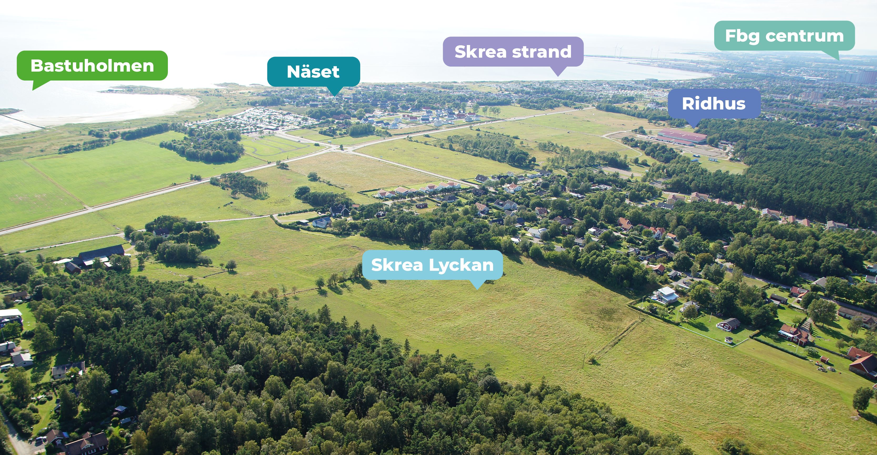 Skrea Lyckan ligger i södra Falkenberg, drygt fyra kilometer från centrum och en kilometer från stranden. På området som är 21 hektar ger kommande detaljplan möjlighet att bygga cirka 200 bostäder i blandade boendeformer samt en ny förskola. Nu kan intresserade byggherrar medverka i en markanvisningstävling i ett mindre område avsett för rad-par eller kedjehus.
