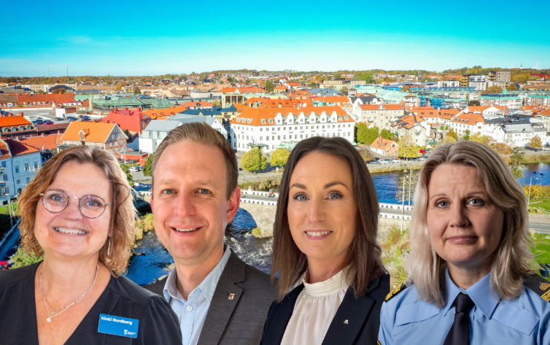 Från vänster: Kicki Nordberg, kommundirektör, Per Svensson, kommunstyrelsens ordförande, Sandra Johansson, oppositionsråd och Ulrica Strömkvist, lokalpolisområdeschef Falkenberg.