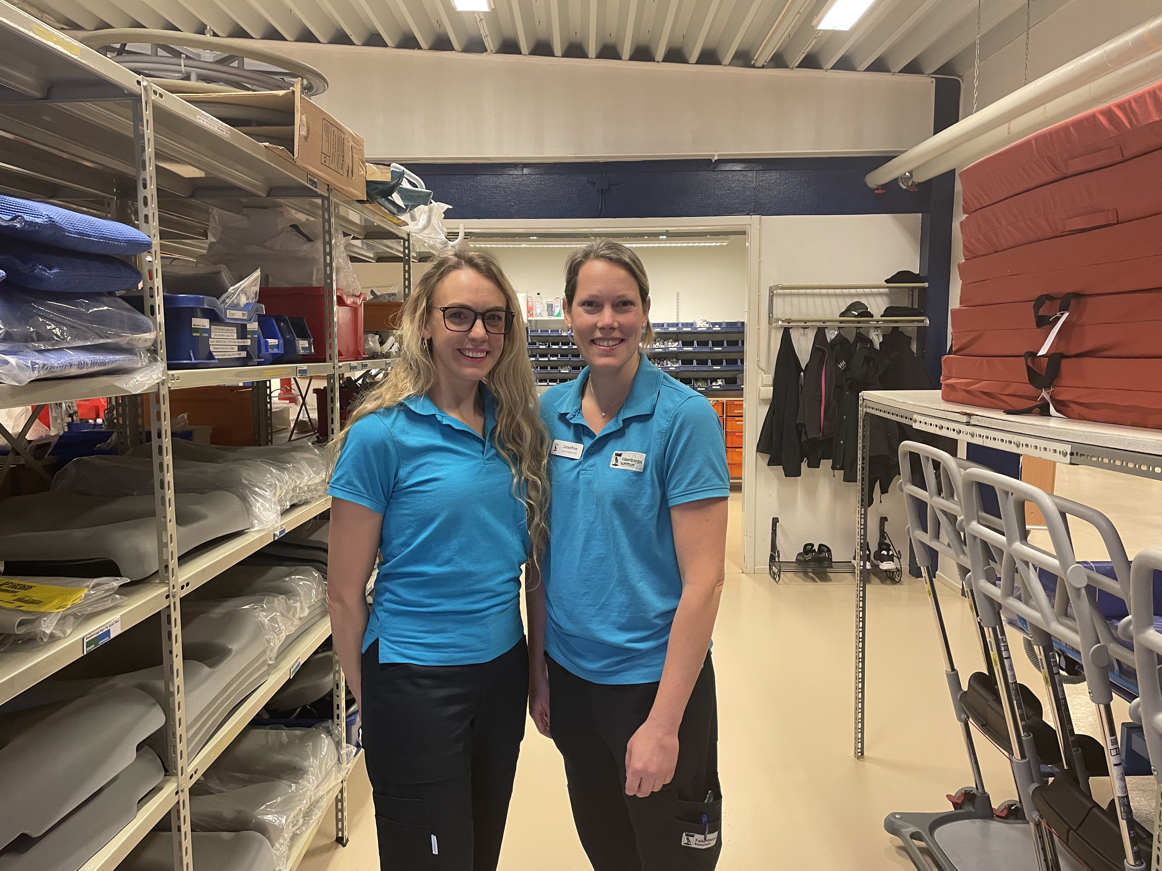 Isabel Jacobsen är arbetsterapeut och Josefine Esbjörnsson är sjukgymnast. Här syns de i lokalerna hos Hjälpmedelsservice, där kommunen har ett eget hjälpmedelslager.
