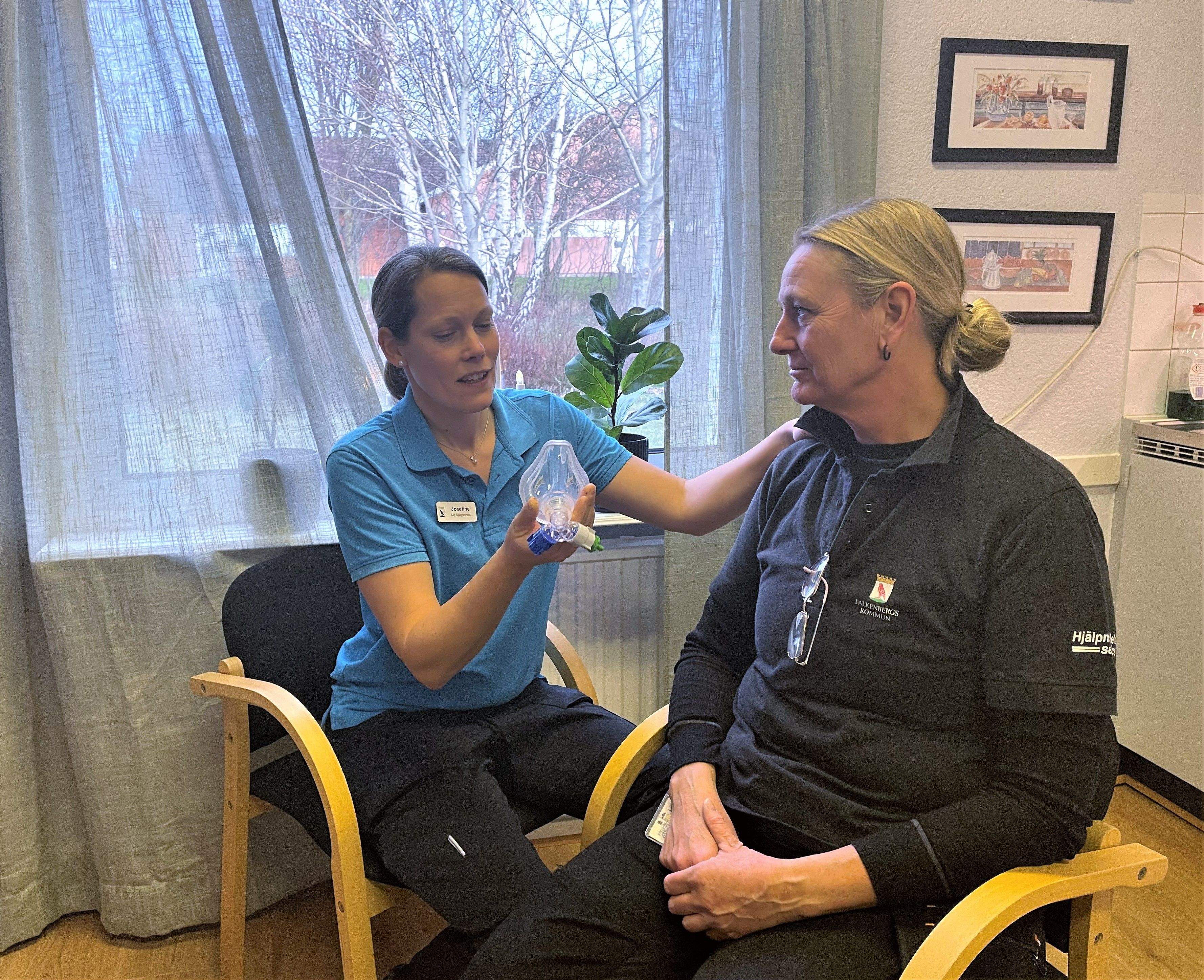 Isabel Jacobsen och Josefine Esbjörnsson ingår i samma team inom Falkenbergs kommuns hemsjukvård och tillbringar därför större delen av sina arbetsdagar ihop. Båda två har alltid haft ett intresse för att jobba med människor, men vägen till deras respektive yrkesval såg lite olika ut. För Josefine började det när hon som liten ofta fick följa med sin mamma till hennes jobb som undersköterska inom äldreomsorgen, och detta i kombination med ett idrottsintresse gjorde senare att Josefines val av utbildning föll på att bli sjukgymnast.
